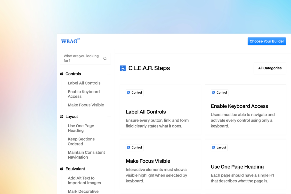 It focuses only on the essential steps designers need to fix the most common accessibility issues. Using the C.L.E.A.R framework, WBAG gives designers a clear, fast, builder-friendly path to a more accessible website.